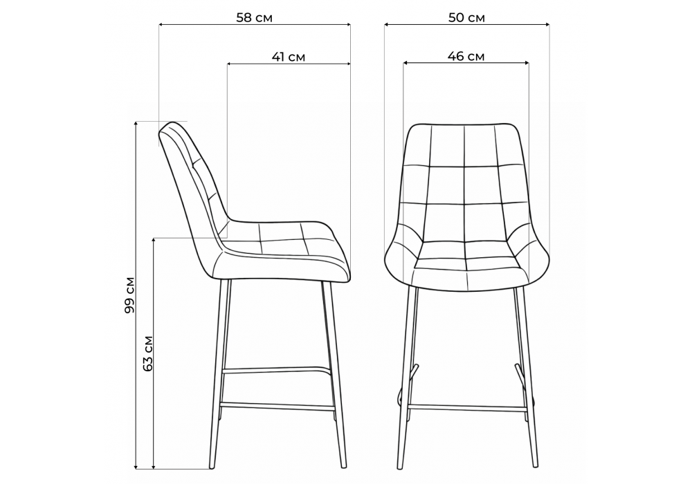 Материал каркаса - металл; Материал сиденья - велюр; Материал обивки - велюр; Цвет ножек - белый; Ширина - 50; Глубина - 58; Высота - 99; Ширина сиденья - 46; Глубина сиденья - 41; Высота сиденья - 63;