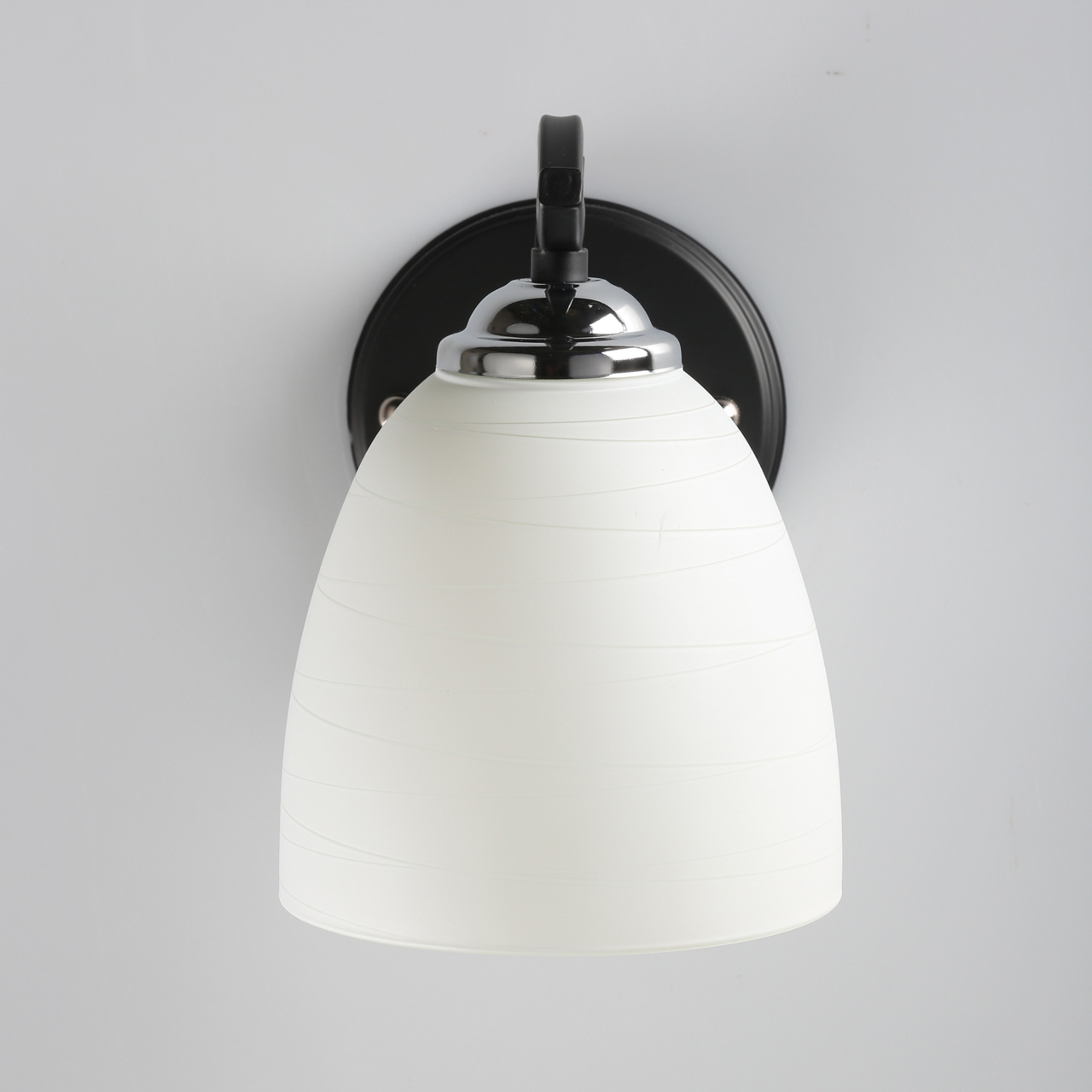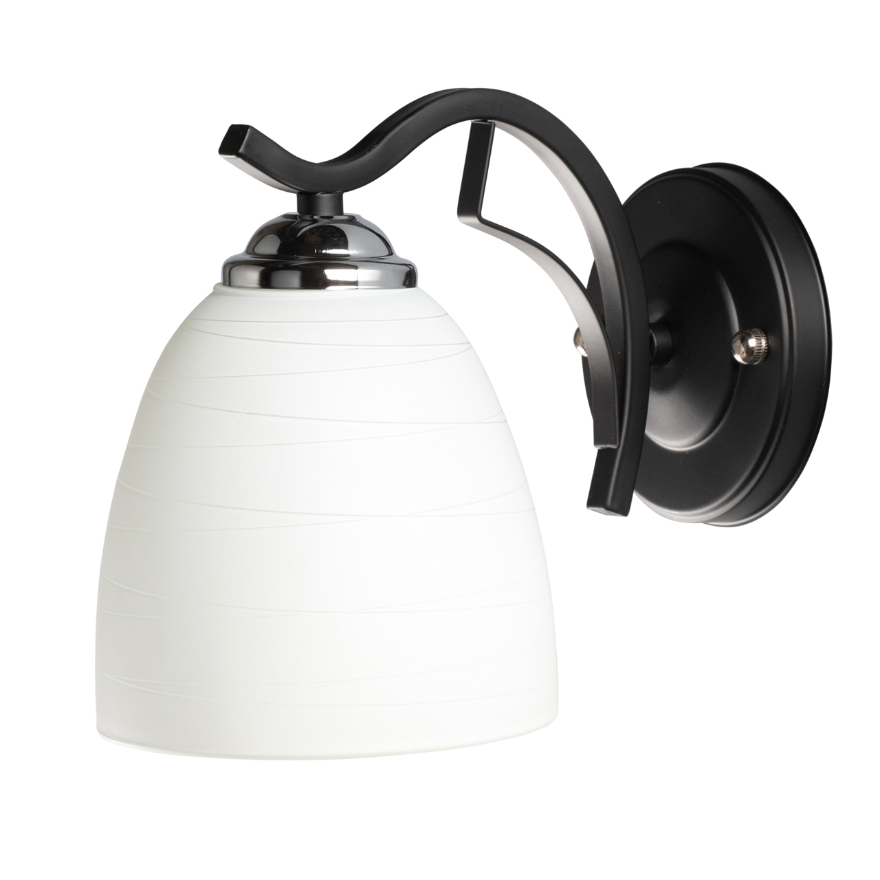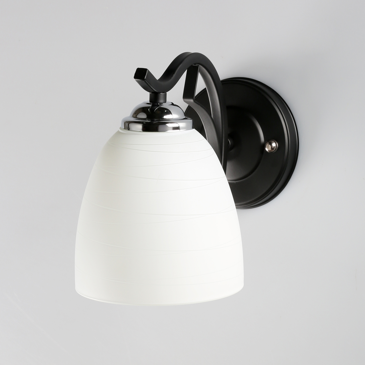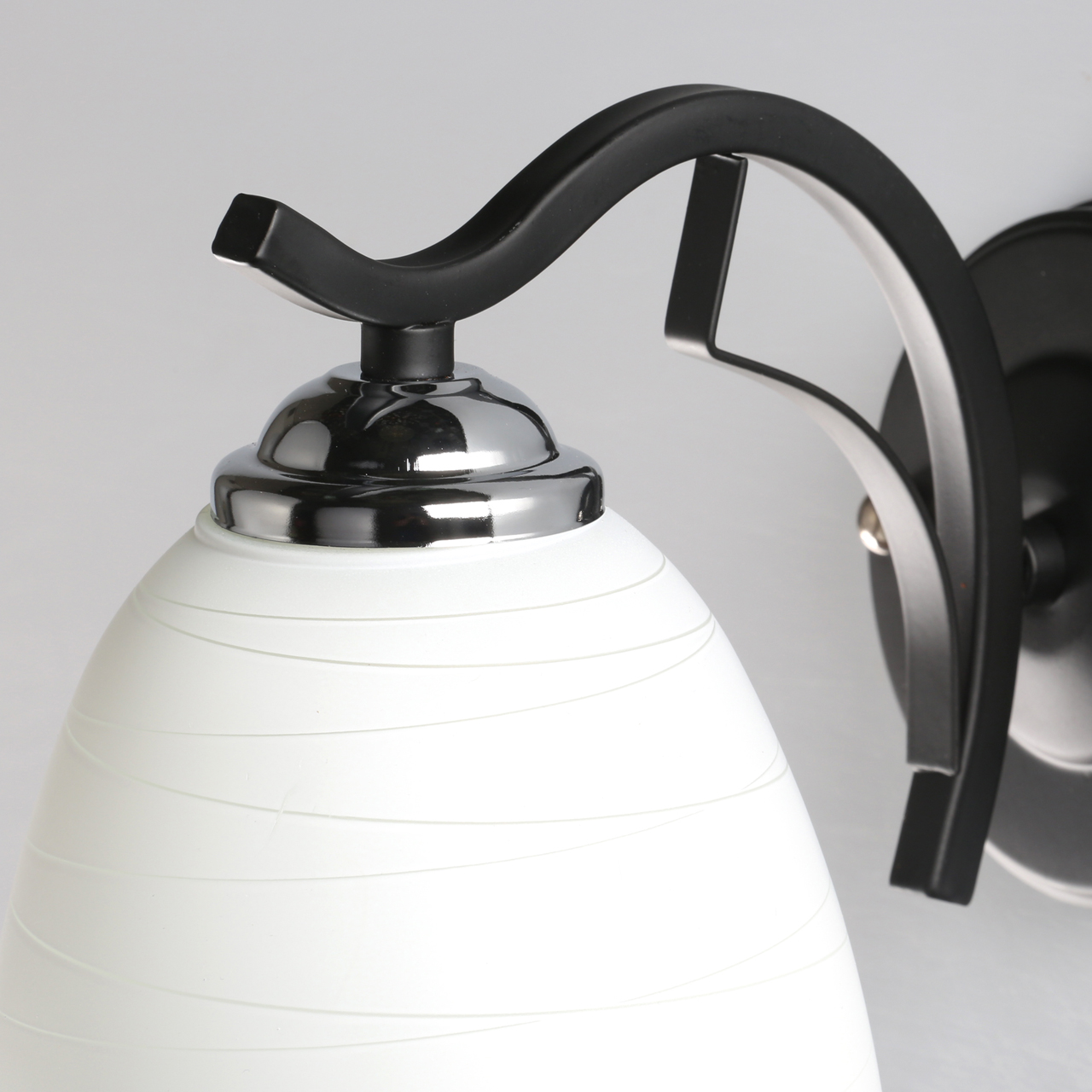 Основание светильника выполнено из сплава металла и окрашено в черный цвет. Стеклянный плафон окрашен в белый цвет.