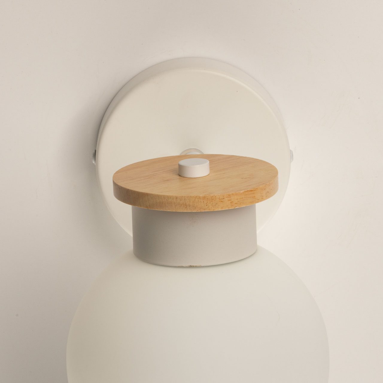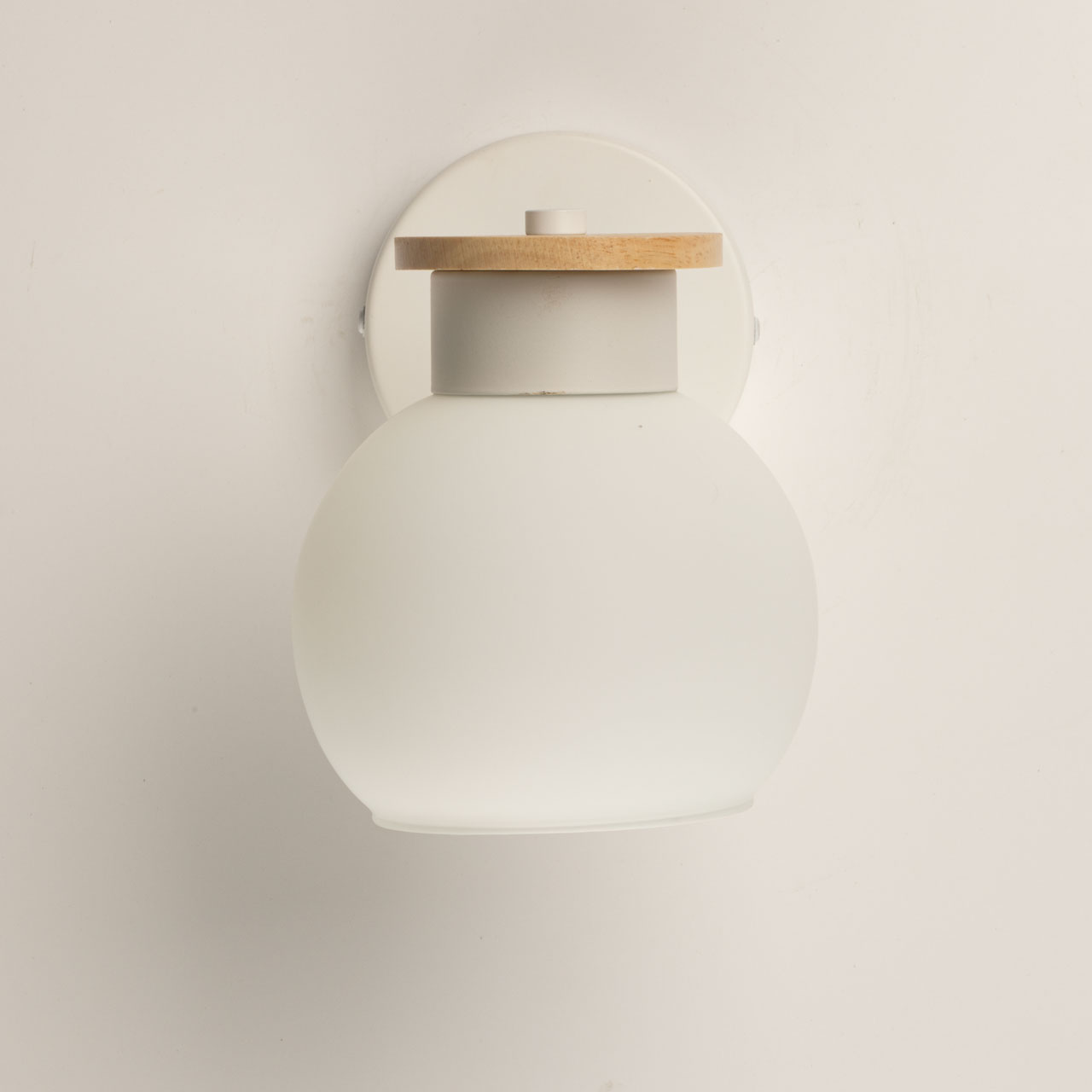 Металлическое основание бра окрашено в белый цвет. Стеклянный плафон отлит в форму и окрашен в белый цвет с внутренней стороны. Светильник декорирован элементом из натурального светлого дерева.