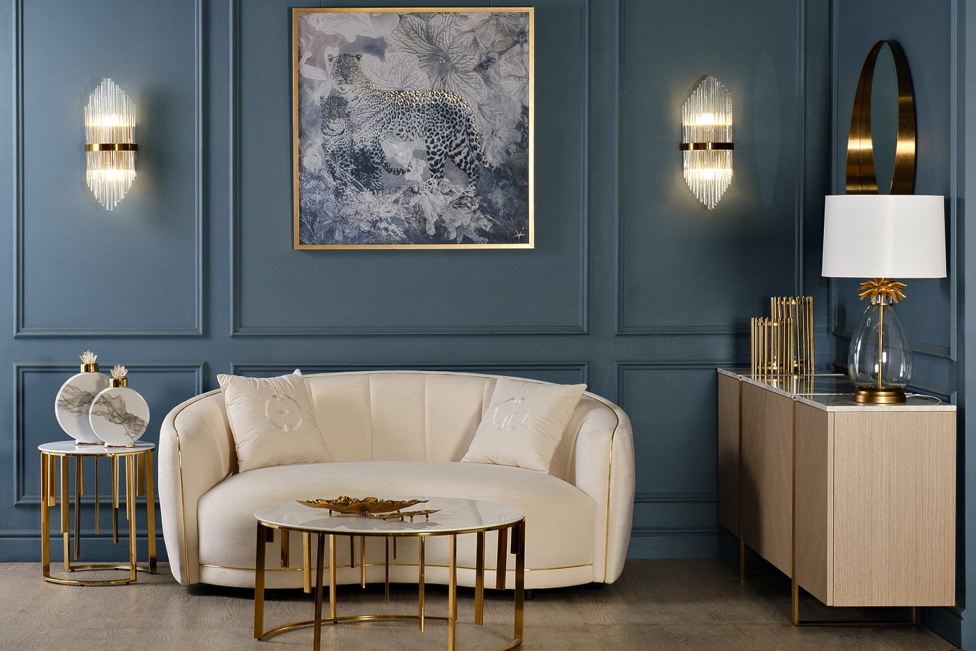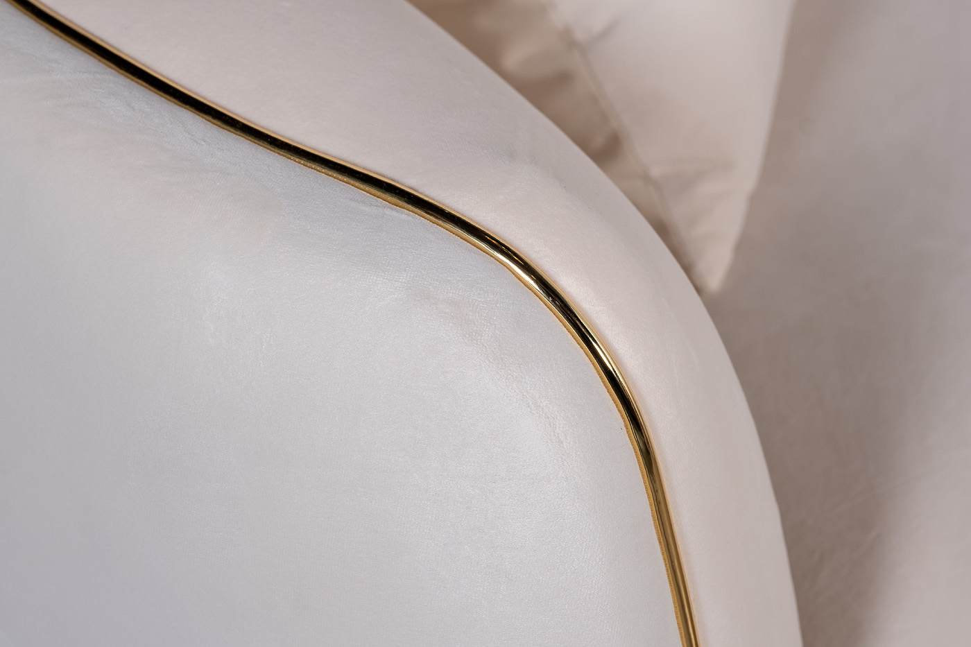 Велюровый диван с плавными формами приятного кремово-бежевого тона - настоящая жемчужина. Золотая окантовка придает ему изысканный и законченный вид. В комплект входят две декоративные подушки 47*47см с вышивкой эмблема в цвет ткани.