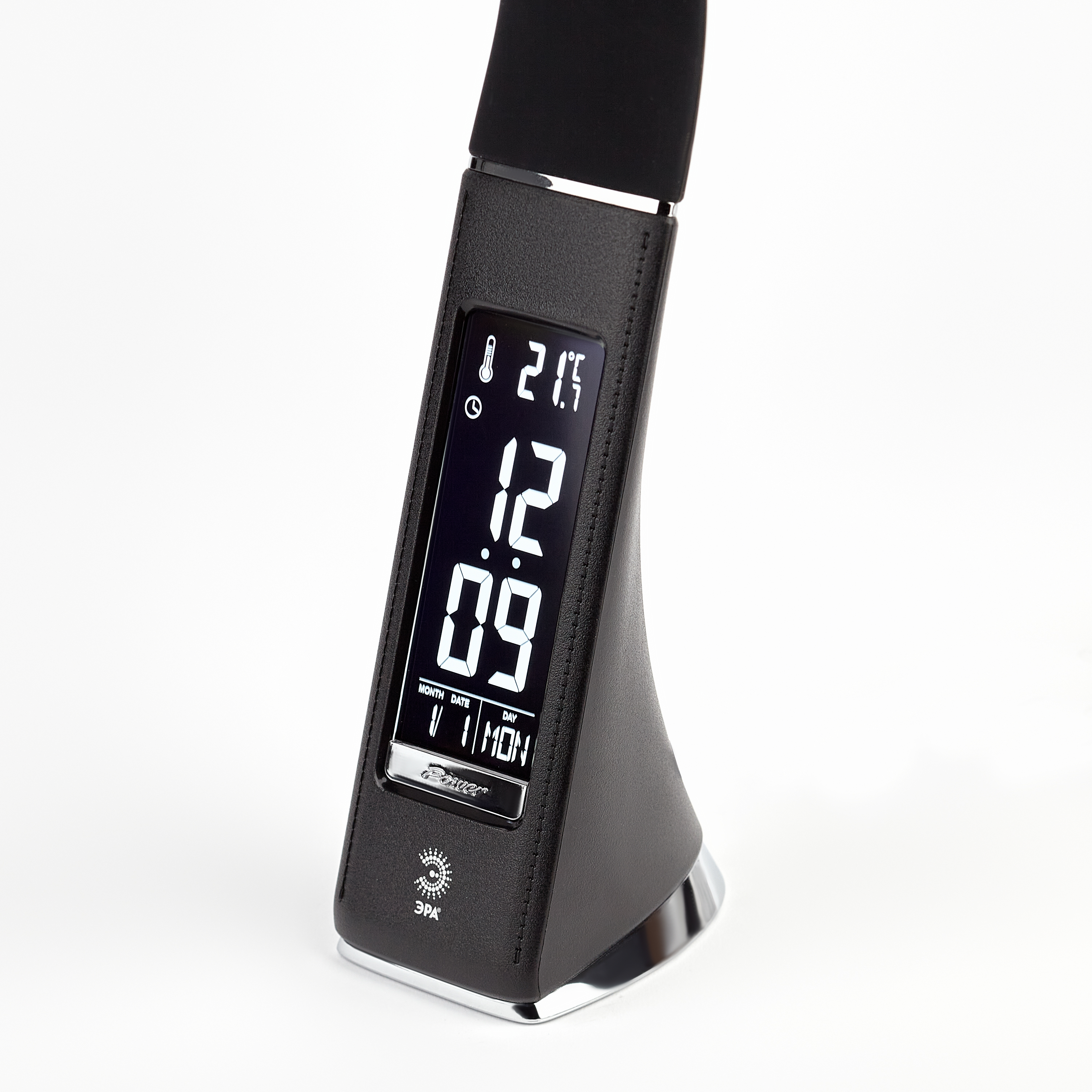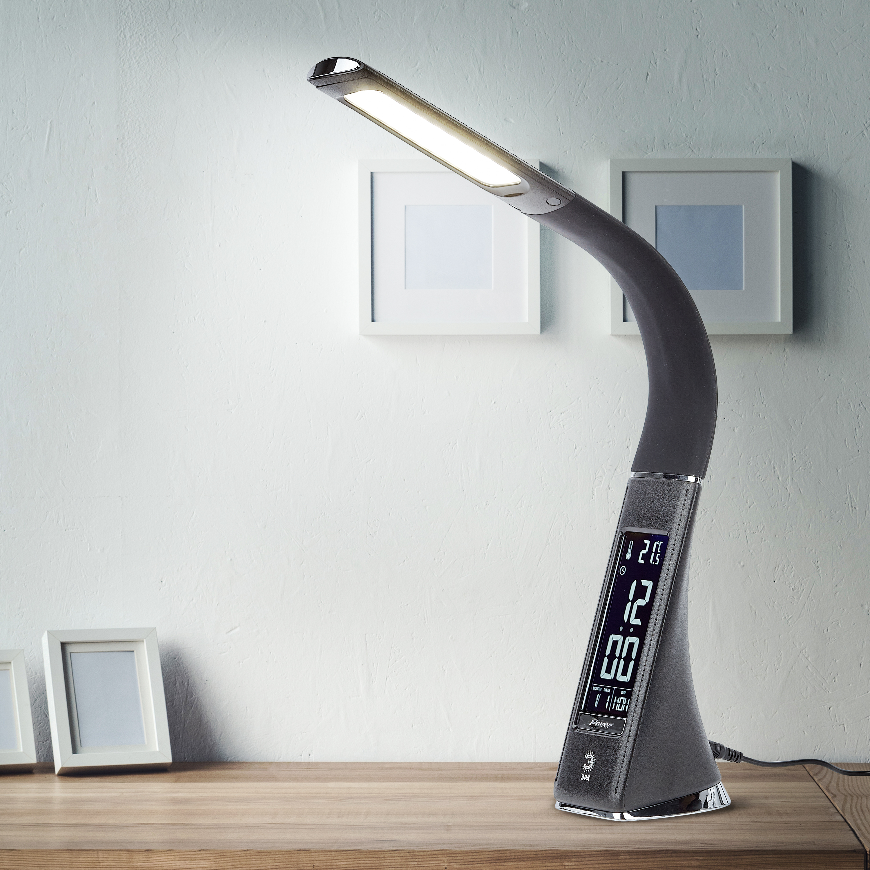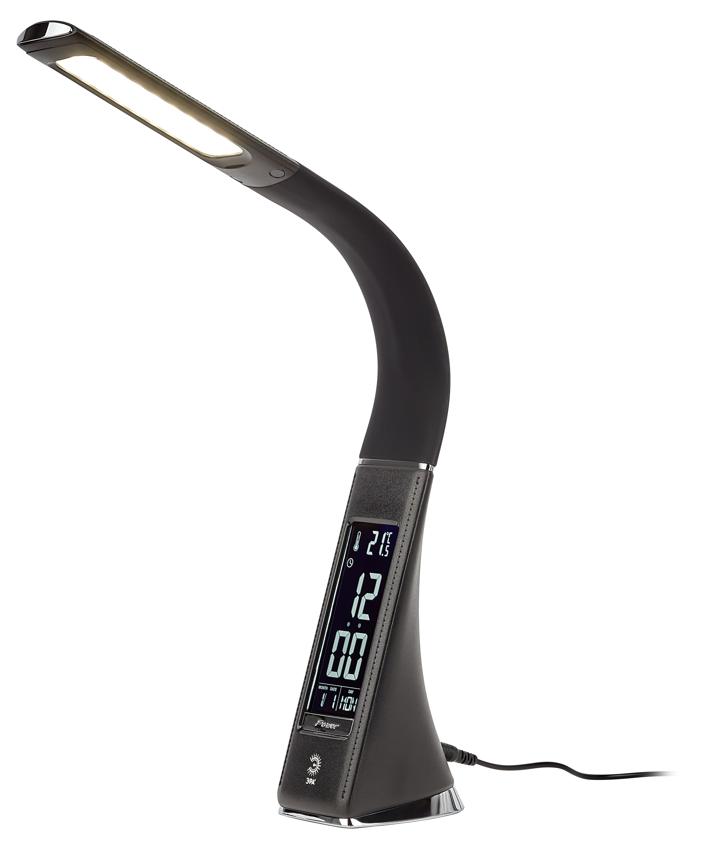 Настольный светильник ЭРА NLED-461-7W-BK со светодиодами (LED) в качестве источников света в дизайне "под кожу". Оснащен сенсорным управлением, есть регулировки яркости освещения - 3 уровня. Главное преимущество светильника - ЖК дисплей с функциями часов, будильника, календаря и термометра. Сенсорная кнопка с обратной стороны стойки обеспечивает опцию выбора яркости дисплея с возможностью его выключения. Высота плафона регулируется гибкой стойкой, направление света регулируется поворотом плафона в любом направлении.