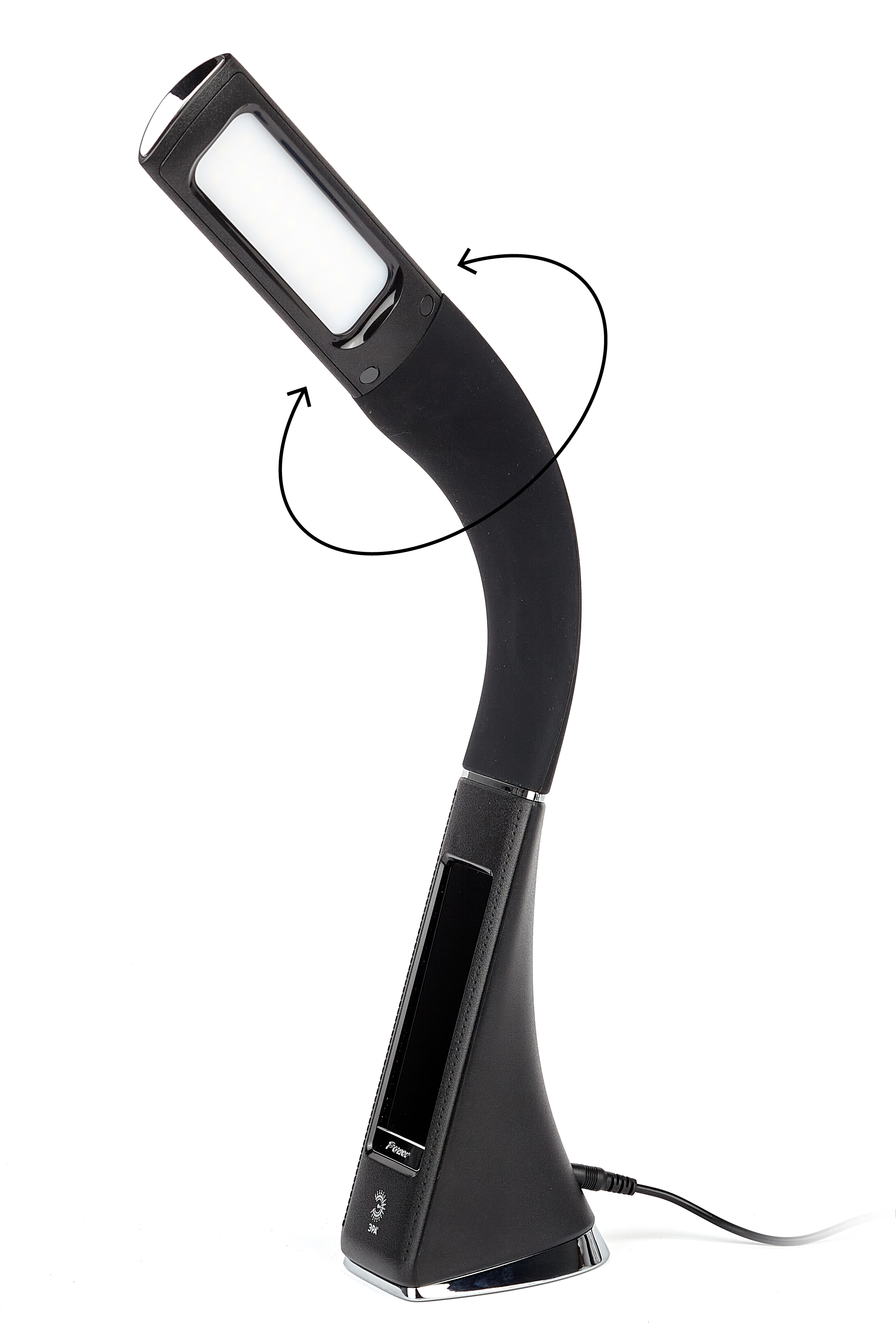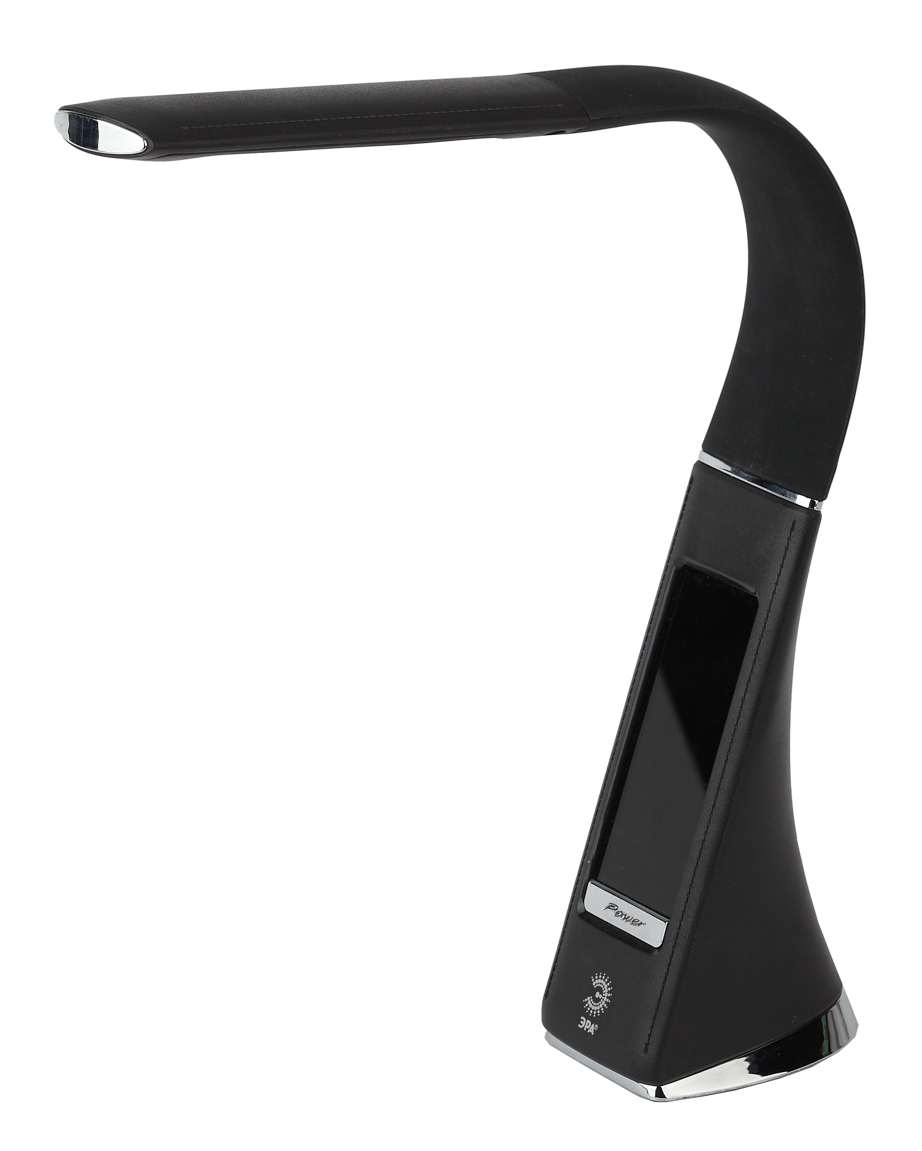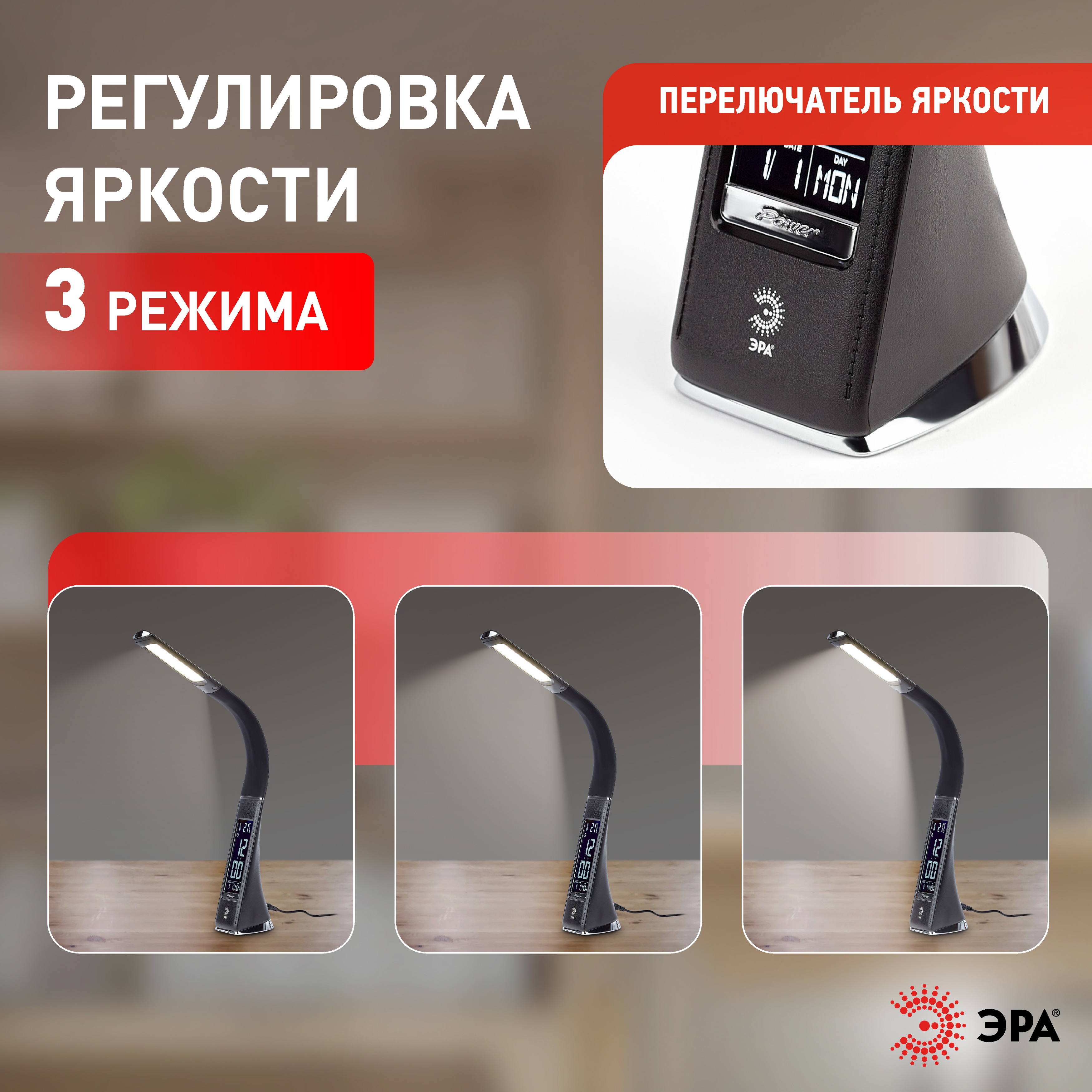 Настольный светильник ЭРА NLED-461-7W-BK со светодиодами (LED) в качестве источников света в дизайне "под кожу". Оснащен сенсорным управлением, есть регулировки яркости освещения - 3 уровня. Главное преимущество светильника - ЖК дисплей с функциями часов, будильника, календаря и термометра. Сенсорная кнопка с обратной стороны стойки обеспечивает опцию выбора яркости дисплея с возможностью его выключения. Высота плафона регулируется гибкой стойкой, направление света регулируется поворотом плафона в любом направлении.