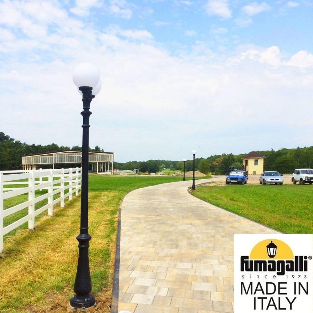 Парковый фонарь FUMAGALLI среднего размера серии GLOBE 300, модель NEBO OFIR/GLOBE 300 2L. Парковый фонарь с 2 светильниками, на консолях OFIR среднего размера, установленных на классическом столбе NEBO высотой 2,5 м (+высота фонарей на кронштейнах). Изготовлены в Италии, по уникальным технологиям "FUMATECH" из современного композитного полимера RESIN. Этот материал в 5 раз прочнее металла, не ржавеет, не окисляется, не выгорает на солнце, его не нужно красить. Все светильники пыле-влаго защищены по стандарту IP55 (Пылезащищенные, защита от водяных струй с любого направления). Рассеиватель выполнен из антивандального, не мутнеющего и не горючего PMMA (ПолиМетилМетаАкрилат). Срок службы светильника - не менее 20 лет. Температура использования от -60 до +90. В серии GLOBE 300 есть садовые фонари в настенном (OFIR/GLOBE 300, MIRRA/GLOBE 300) подвесном (SICHEM/GLOBE 300) и наземном исполнении (IAFAET.R/GLOBE 300, ALOE.R/GLOBE 300, ARTU/GLOBE 300, GIGI/GLOBE 300, RICU/GLOBE 300, NEBO/OFIR/GLOBE 300 1L, NEBO/OFIR/GLOBE 300 2L, TABOR/ADAM/GLOBE 300 3L) со столбами разной высоты, с разным количеством и конфигурацией голов. Консоли настенных фонарей и кронштейны светильников на столбах освещения могут устанавливаться в положение вверх и вниз. Столбы выше 150 см имеют в основе мощную стальную трубу с двойной оцинковкой. При заказе требуется выбрать цвет корпуса, цвет плафона и тип патрона (Е-27 или LED GX-53). Возможен светодиодный вариант. По стилю и дизайну серия уличных светильников GLOBE 300 похожа на светильники большого размера серии GLOBE 250 и GLOBE 400 . По размеру относится к средним парковым светильникам как серия RUT и CEFA.