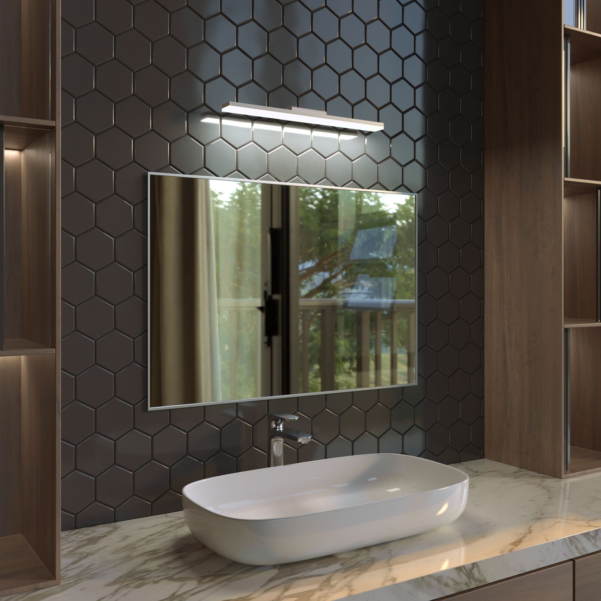 Энергоэффективные светодиоды мощностью 12 Вт образуют равномерный световой поток 1100 лм и имеют долгий срок службы - 50 000 ч. В производстве настенного светильника использовали высококачественный акрил и алюминиевый сплав с надежным защитным покрытием. Благодаря простой конструкции эргономичный и компактный накладной светильник легко монтируется на любые типы поверхностей.