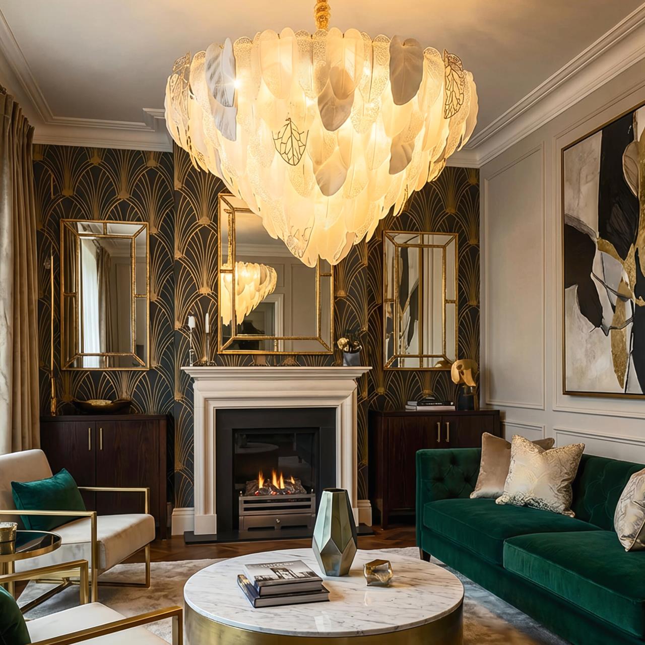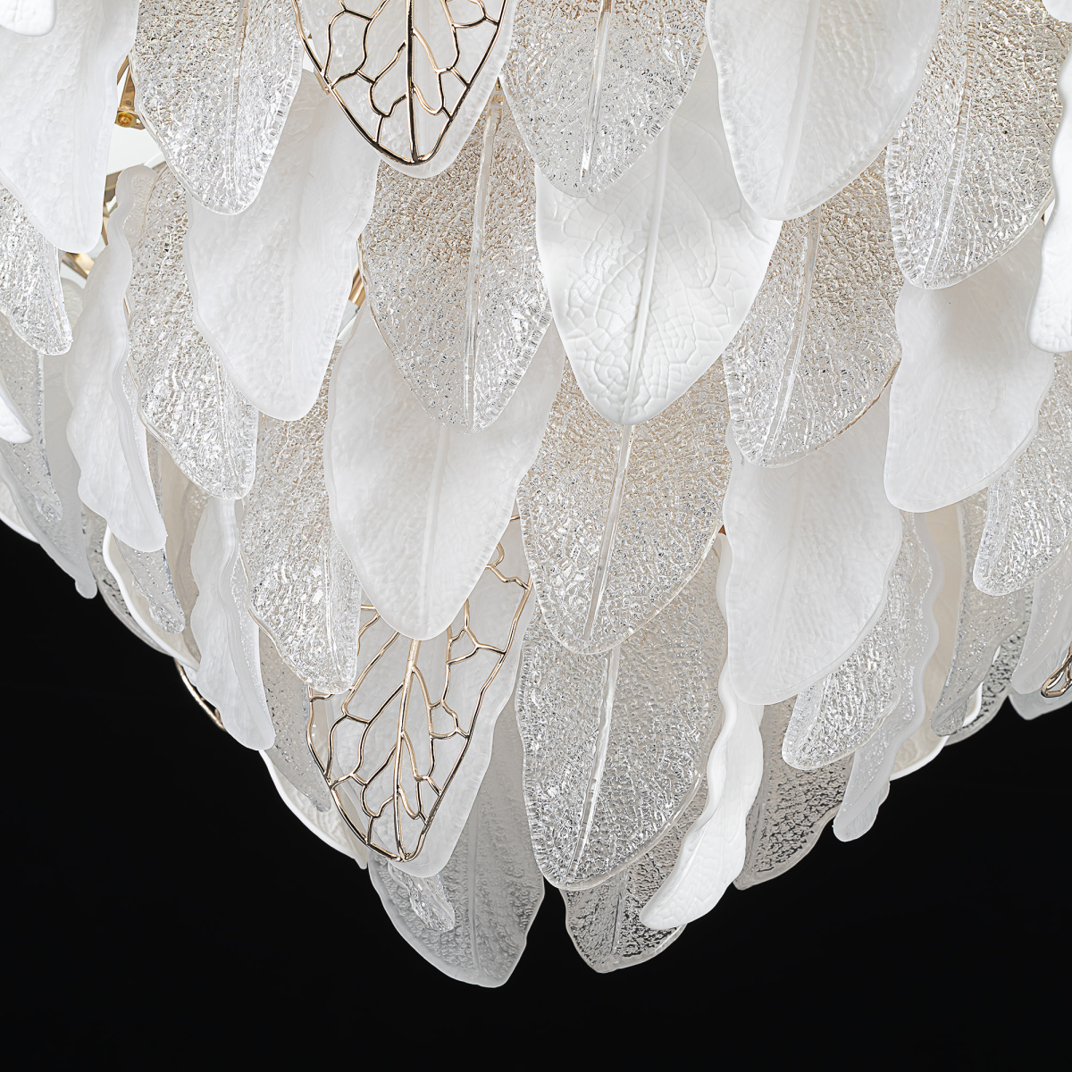 Металлический каркас золотистого оттенка переливается в лучах света. Листья из полуматового и прозрачного рифленого стекла, белой керамики, а также металлические листья с прожилками, отлитые по ювелирной технологии, подчеркивают флористическую изысканность и четкость силуэта люстры. В изделии используются 29 лампочек с цоколем Е14, высоту подвесной цепи можно отрегулировать.