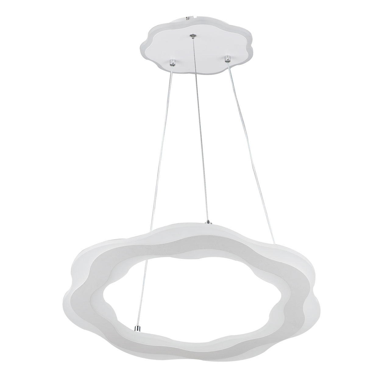 Металлическое основание подвесной люстры окрашено в белый цвет. Светодиодные источники света закрыты белым матовым акрилом.