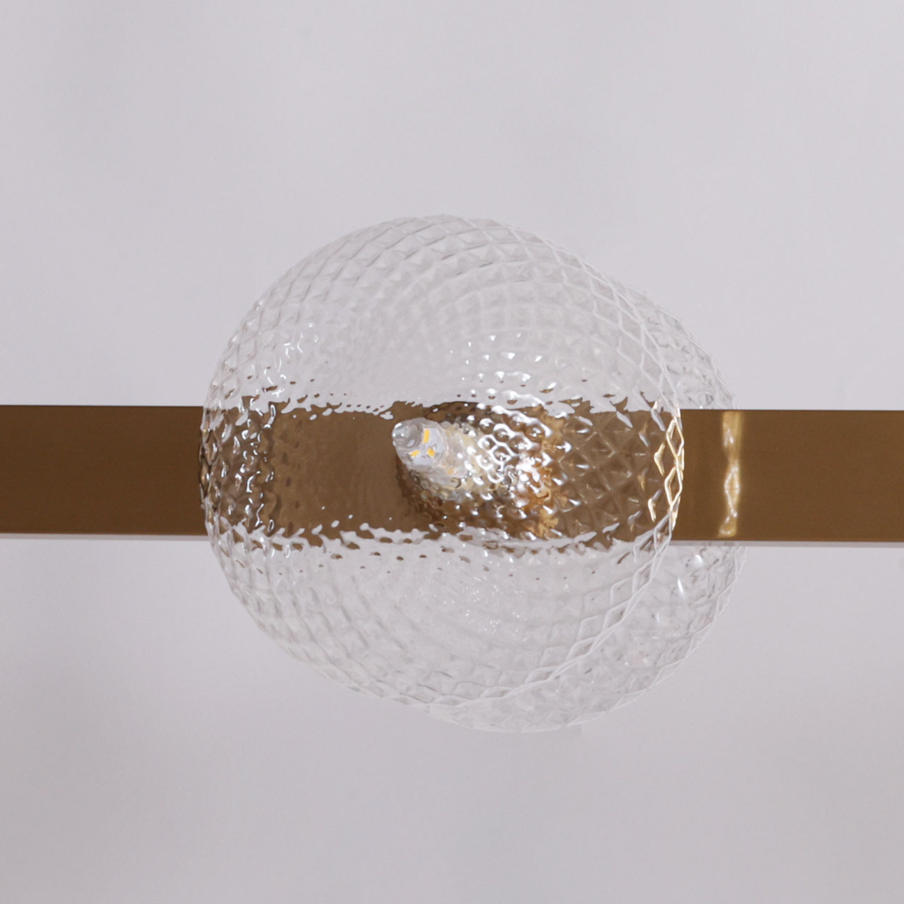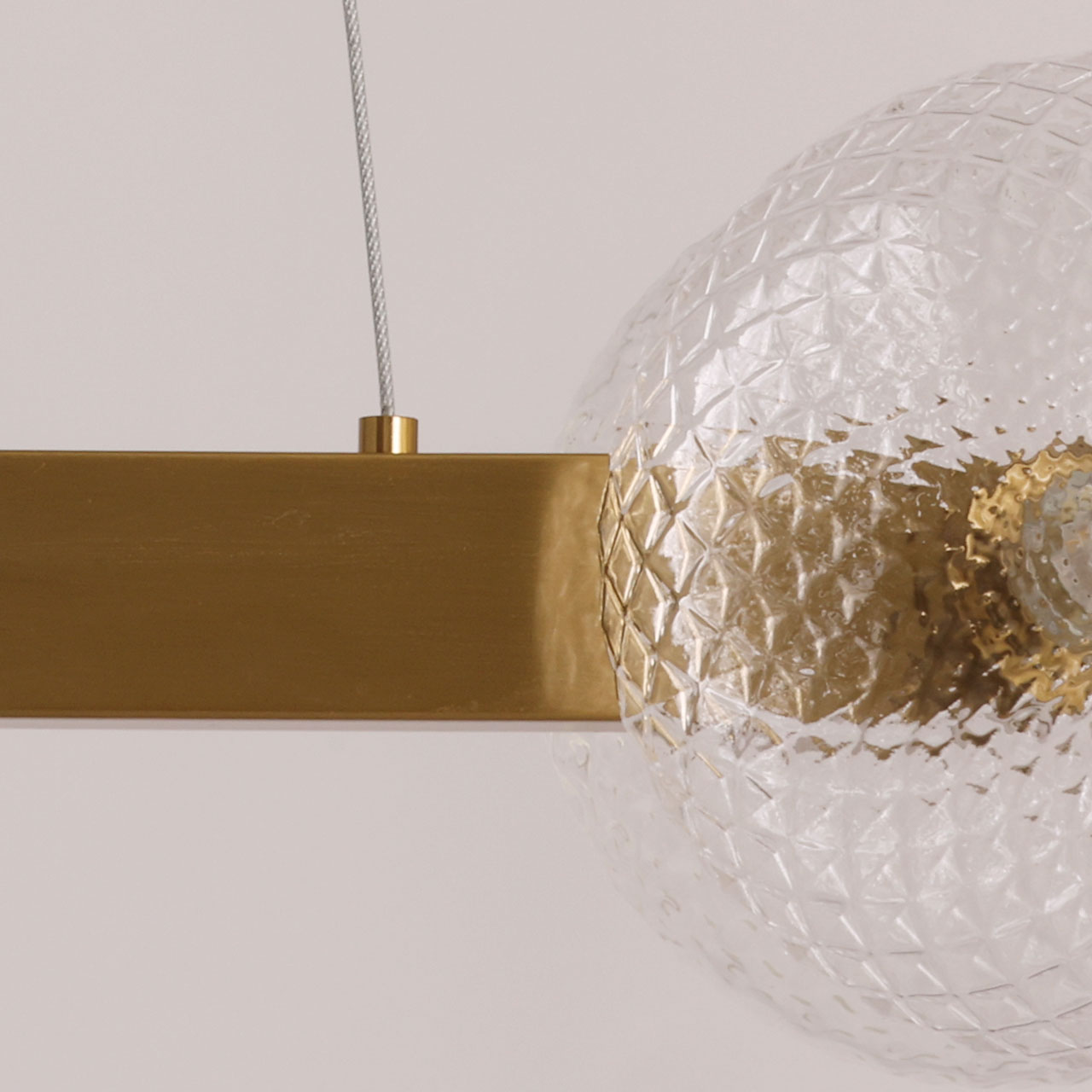 Металлическое основание подвесной люстры гальванизировано в цвет латуни. Светильник декорирован полусферами из прозрачного фактурного стекла.