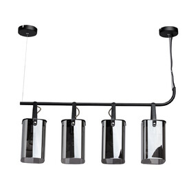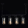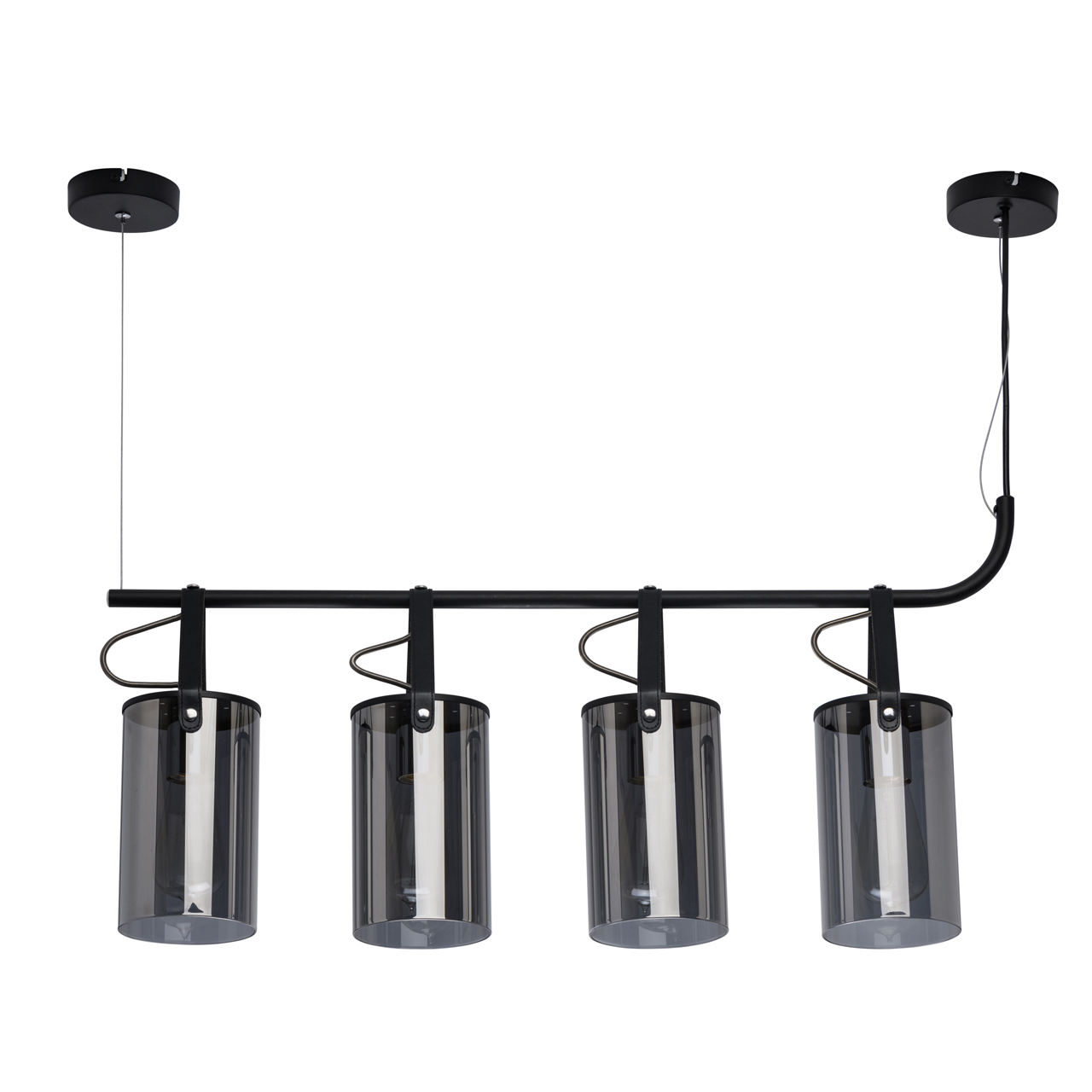 На парящей планке расположены 4 подвеса из стекла цвета антрацита. Основание из металла окрашено в черный цвет. К нему крепятся черные кожаные ремешки, которые и удерживают на весу источники освещения. Свет получается мягким, приглушенным, создает умиротворяющую, романтичную атмосферу. Модель идеально подходит для создания акцентов на конкретных зонах: подсветки обеденного стола, барной стойки, зоны отдыха.