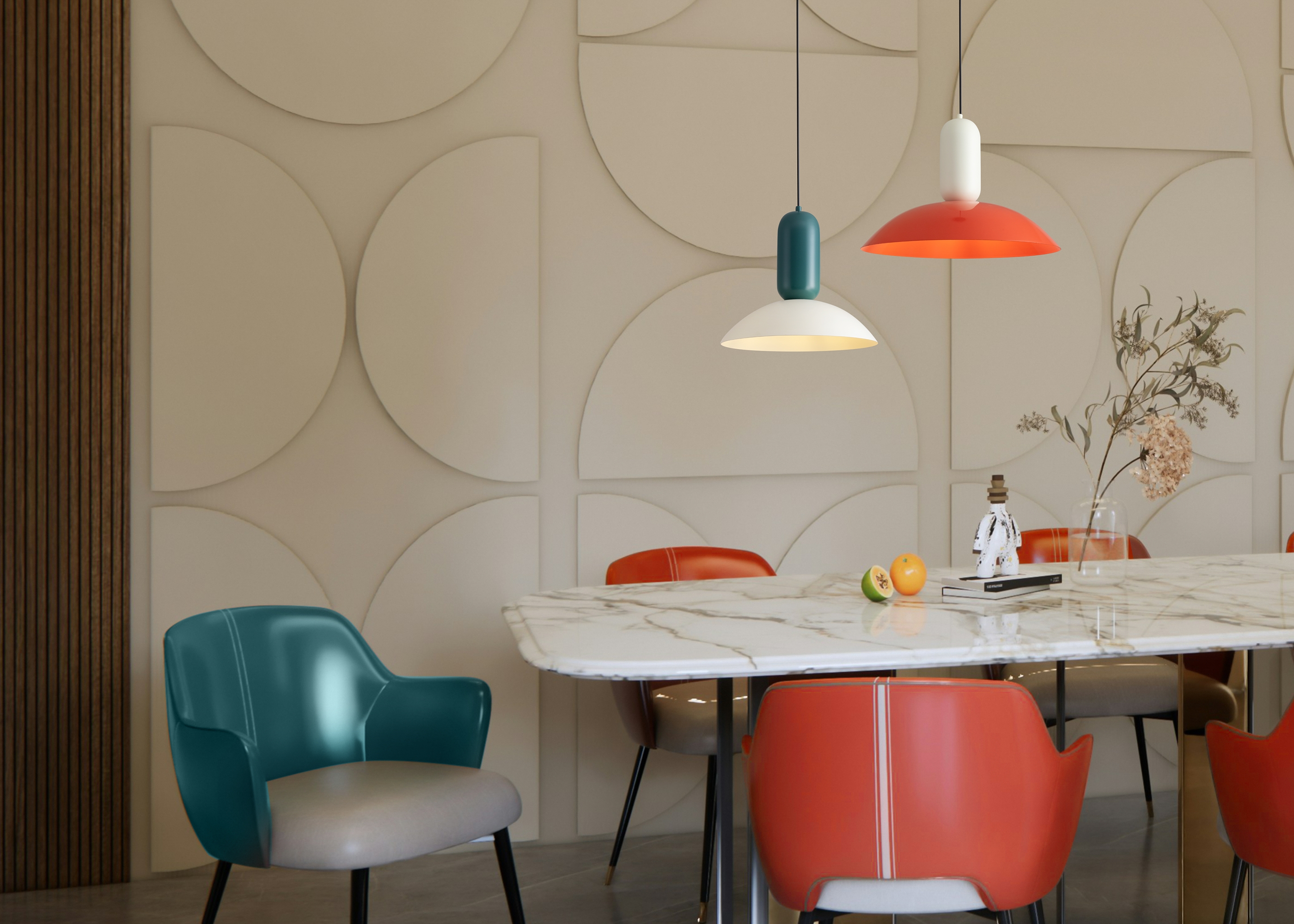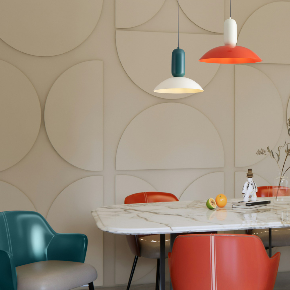 Арматура - чёрный металл.Каждый подвесной светильник окрашен в 2 цвета: серо-бежевый и жемчужно-белый, каменно-серый и белый, белый и каменно-серый. з новинки в сочетниях новых оттенков - чисто красный и мята бирюзовая.
