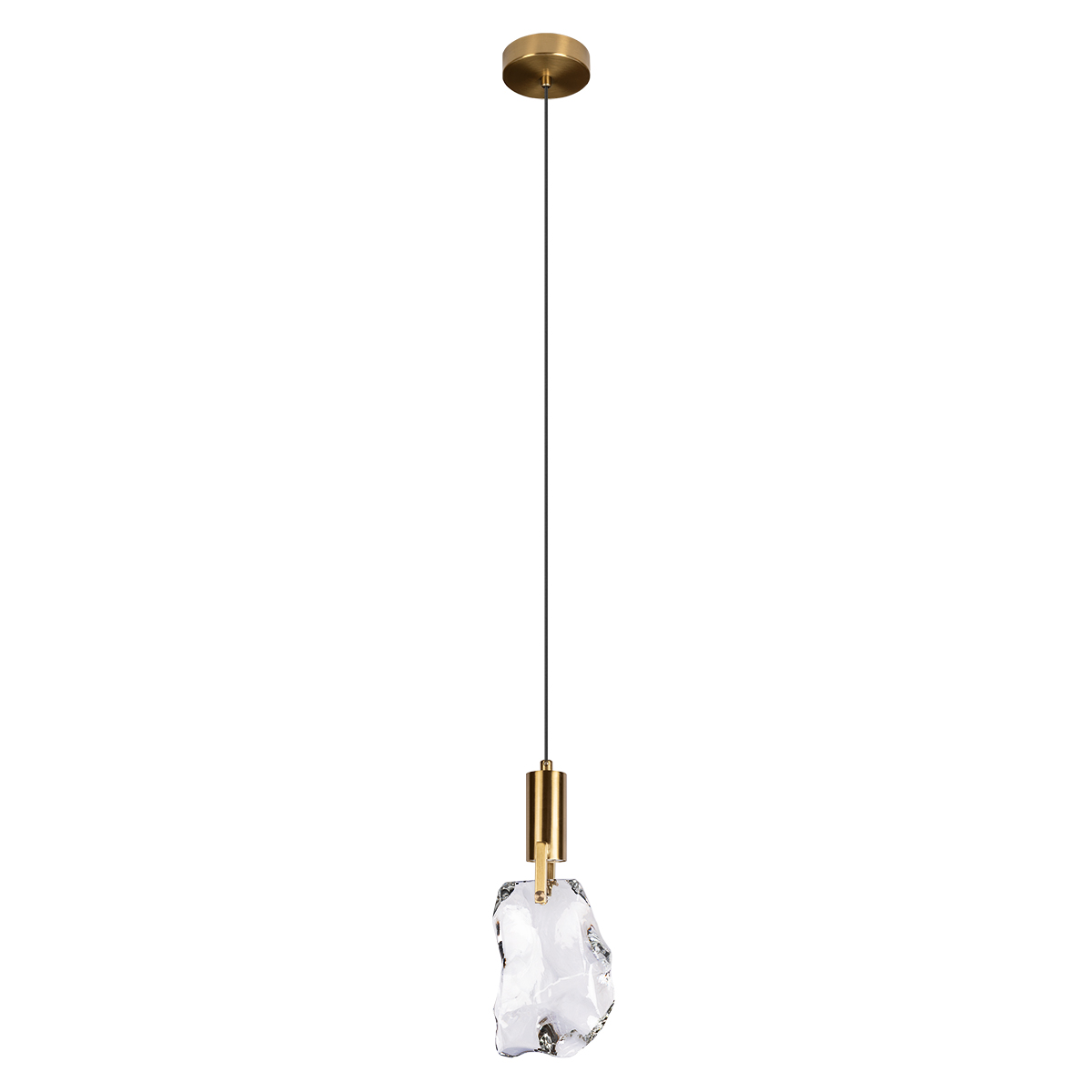 Лаконичное сочетание матового золота, прозрачного «камня» и чёрного акцента делает светильник универсальным: он легко вписывается в современный интерьер, лофт, минимализм или эклектичную обстановку. Хорошо смотрится как одиночный акцент над прикроватной тумбой или небольшим столиком, а также впечатляюще выглядит в композиции из нескольких подвесов, расположенных на разной высоте.