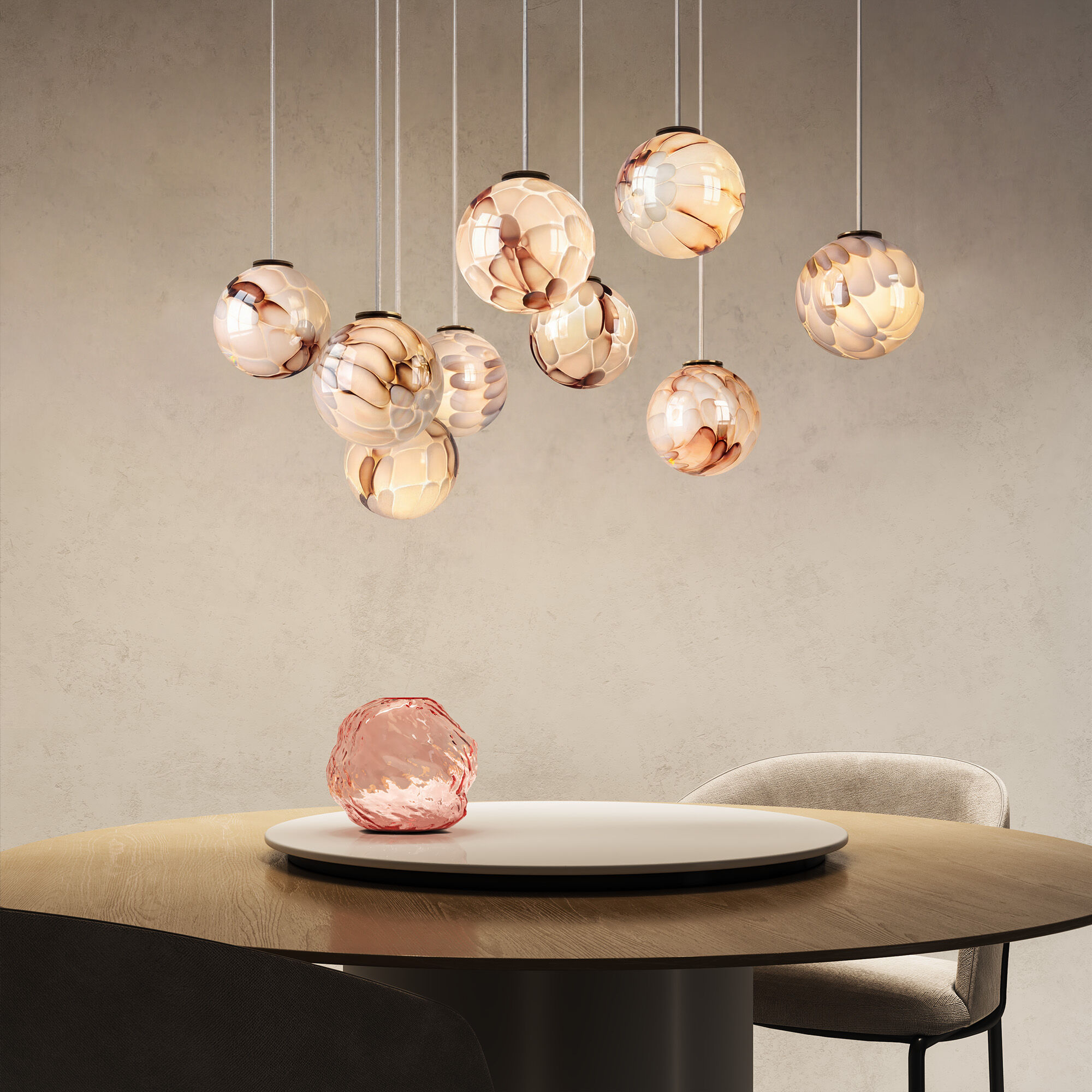 Подвес Crystall — результат кропотливой ручной работы. Подвес с плафонами, выдутыми и окрашенными мастерами вручную, — это не просто освещение, а авторский объект дизайна.