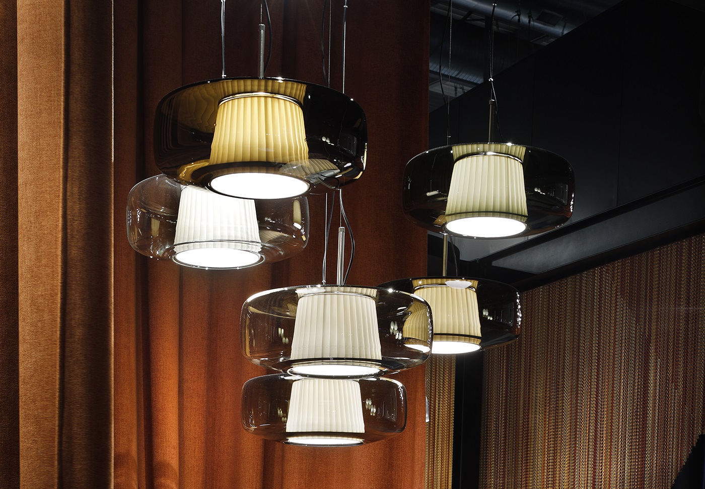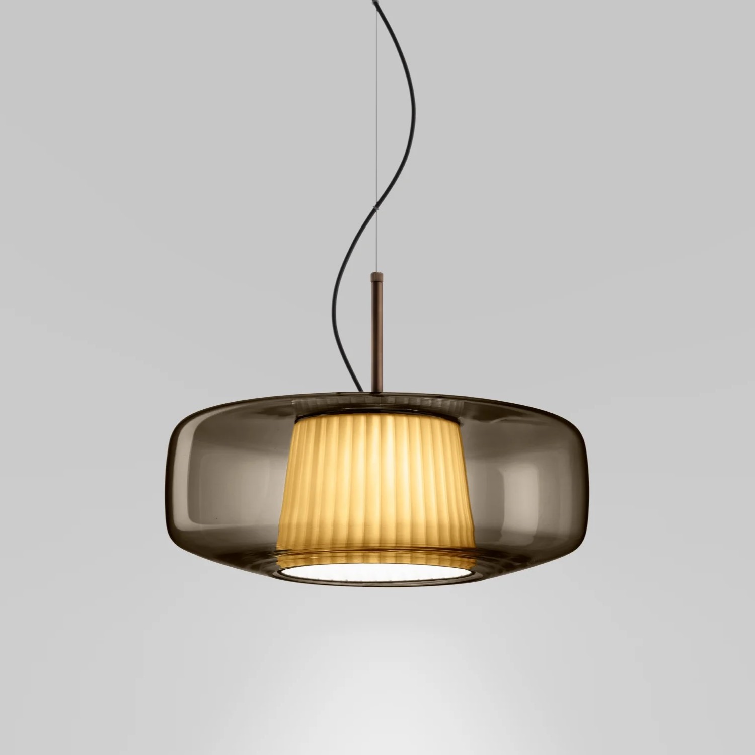 Подвесной светильник Vistosi Plisse SP G Amber с арматурой матового бронзового цвета. Выдувное стекло диффузора дымчатого цвета скрывает внутренний тканевый абажур и дает жизнь игре прозрачности, цветов и текстур, которые делают Plissè элегантным элементом, способным охарактеризовать и придать индивидуальность помещению, в котором он находится.