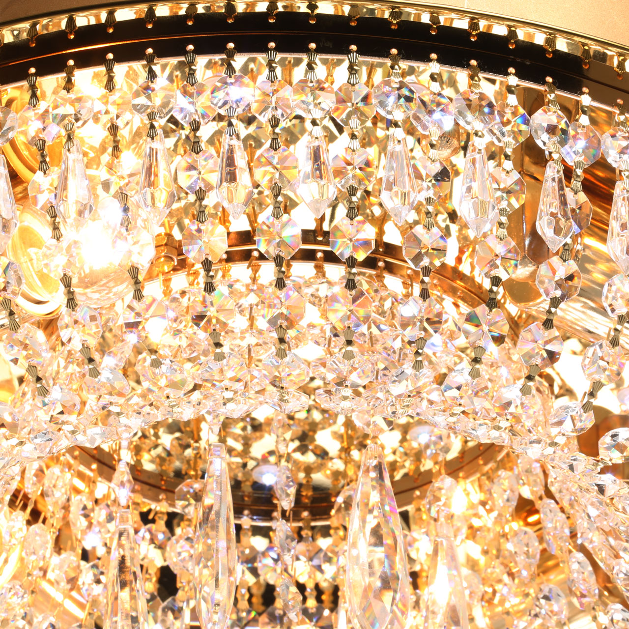 Металлическое основание гальванизировано в цвет французского золота с последующим матированием. Потолочная чаша закрыта листом нержавеющей стали, отполированной до зеркального блеска и гальванизированной в цвет основания. Светильник декорирован прозрачным хрусталем разной формы.