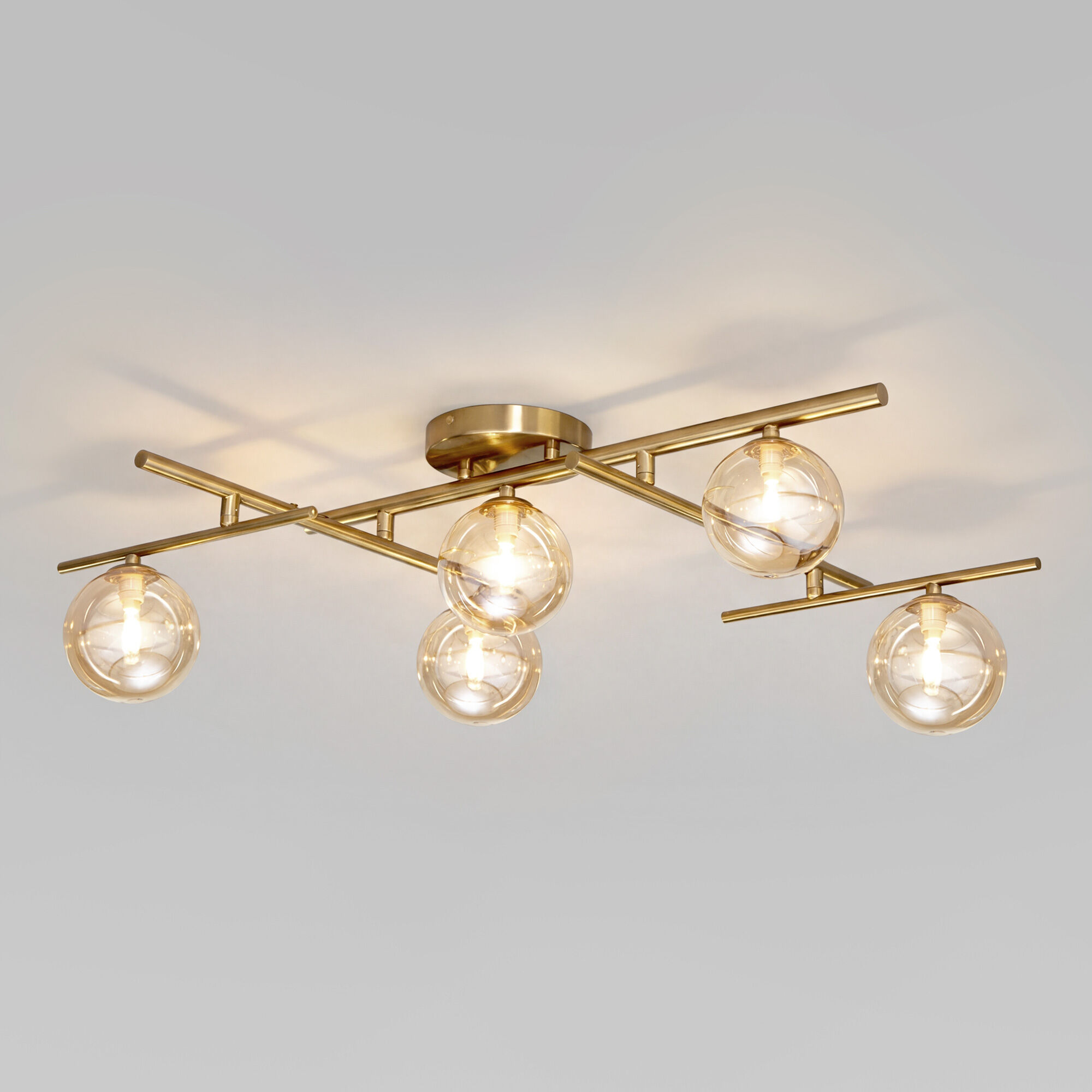 Потолочный светильник из коллекции Liana станет прекрасным дополнением к вашей гостиной, спальне или столовой. Геометрическая конструкция в сочетании со стеклянными янтарными плафонами создает современный и утонченный вид.