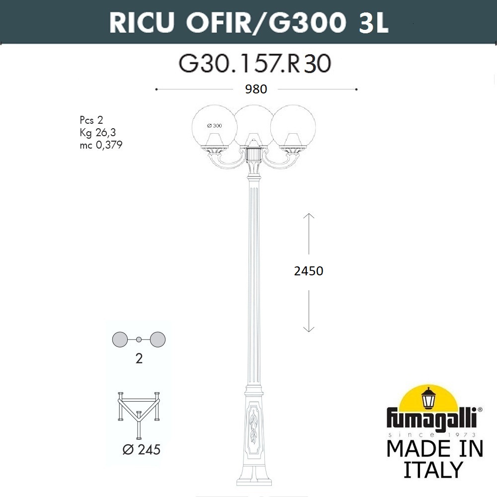 Садово-парковый фонарь FUMAGALLI среднего размера серии GLOBE 300, модель RICU OFIR/GLOBE 300 3L. Садовый светильник с 3 фонарями среднего размера GLOBE 300 на консолях среднего размера OFIR, установленных на столбе RICU высотой 2,0 м (+высота фонаря). Предназначен для освещения парковых дорожек, cкверов, садовых и ландшафтных композиций, и других общественных пространств. Используется в качестве основного уличного освещения на городских улицах и площадях. Изготовлены в Италии, по уникальным технологиям "FUMATECH" из современного композитного полимера RESIN. Этот материал в 5 раз прочнее металла, не ржавеет, не окисляется, не выгорает на солнце, его не нужно красить. Все светильники пыле-влаго защищены по стандарту IP55 (Пылезащищенные, защита от водяных струй с любого направления). Рассеиватель выполнен из антивандального, не мутнеющего и не горючего PMMA (ПолиМетилМетаАкрилат). Срок службы светильника - не менее 20 лет. Температура использования от -60 до +90. В серии GLOBE 300 есть садовые фонари в настенном (OFIR/GLOBE 300, MIRRA/GLOBE 300) подвесном (SICHEM/GLOBE 300) и наземном исполнении (IAFAET.R/GLOBE 300, ALOE.R/GLOBE 300, ARTU/GLOBE 300, GIGI/GLOBE 300, RICU/GLOBE 300, NEBO/OFIR/GLOBE 300 1L, NEBO/OFIR/GLOBE 300 2L, TABOR/ADAM/GLOBE 300 3L) со столбами разной высоты, с разным количеством и конфигурацией голов. Консоли настенных фонарей и кронштейны светильников на столбах освещения могут устанавливаться в положение вверх и вниз. Столбы выше 150 см имеют в основе мощную стальную трубу с двойной оцинковкой. По стилю и дизайну серия уличных светильников GLOBE 300 похожа на светильники большого размера серии GLOBE 400 и малого размера GLOBE 250 . По размеру относится к средним парковым светильникам как серия RUT и CEFA.
