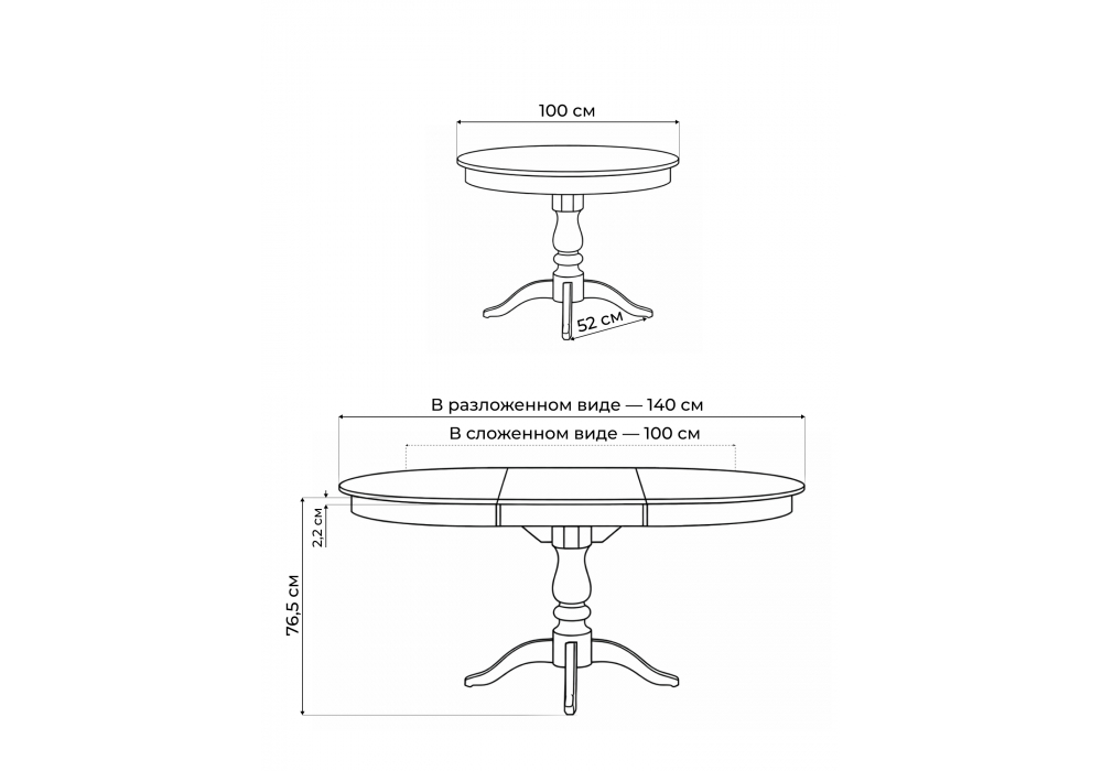 Материал каркаса - массив бука; Материал столешницы - Шпон; Ширина - 100; Высота - 76,5; Длина стола в разложенном виде - 140; Длина - 100;